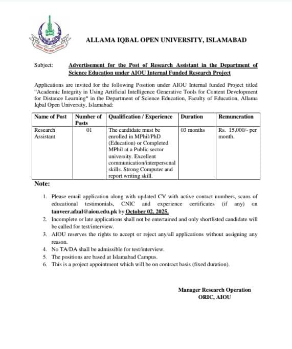 Allama Iqbal Open University (AIOU), Islamabad, has announced a vacancy for the position of Research Assistant under an internal funded project titled “Academic Integrity in Using Artificial Intelligence Generative Tools for Content Development for Distance Learning.” The role is based in the Department of Science Education, Faculty of Education.
