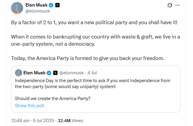 On Saturday, Elon Musk announced on X the creation of the “America Party” to “give-back” freedom to the people and challenge what he described as the country’s “one-party system.”