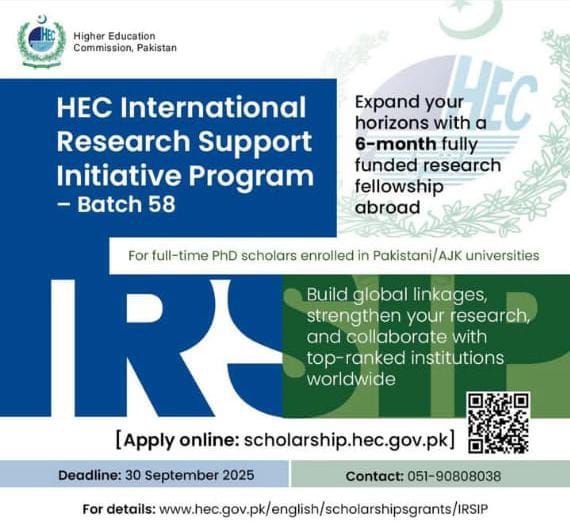 The Higher Education Commission (HEC), Pakistan, has announced that applications are now open for Batch 58 of the International Research Support Initiative Program (IRSIP). This program offers full-time PhD scholars from Pakistan and Azad Jammu & Kashmir (AJK) a unique opportunity to undertake a six-month fully funded research fellowship at top-ranked international institutions.