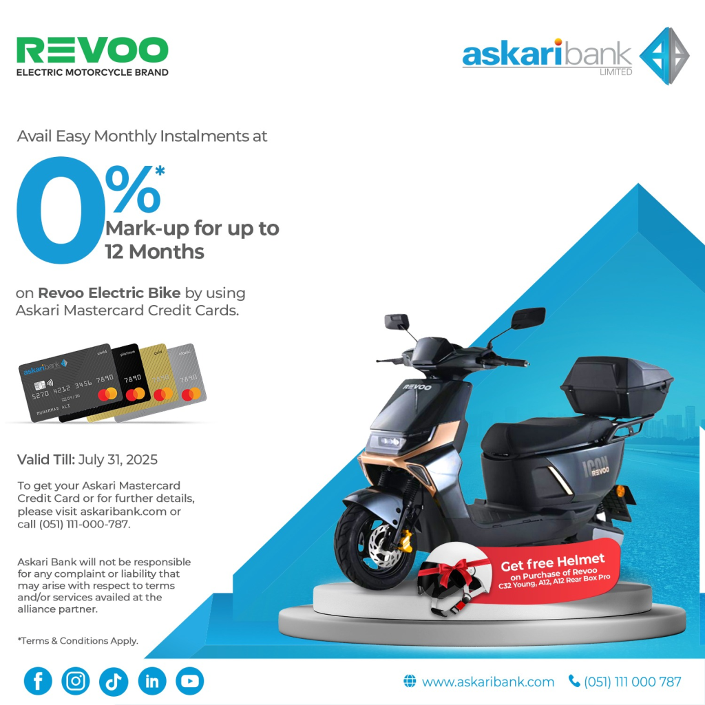 Islamabad, July 17, 2025: In a move to support green mobility and make electric bikes more affordable, Askari Bank has rolled out a zero percent markup installment plan for REVOO electric bikes. The offer is exclusively available for Askari Mastercard Credit Card holders.