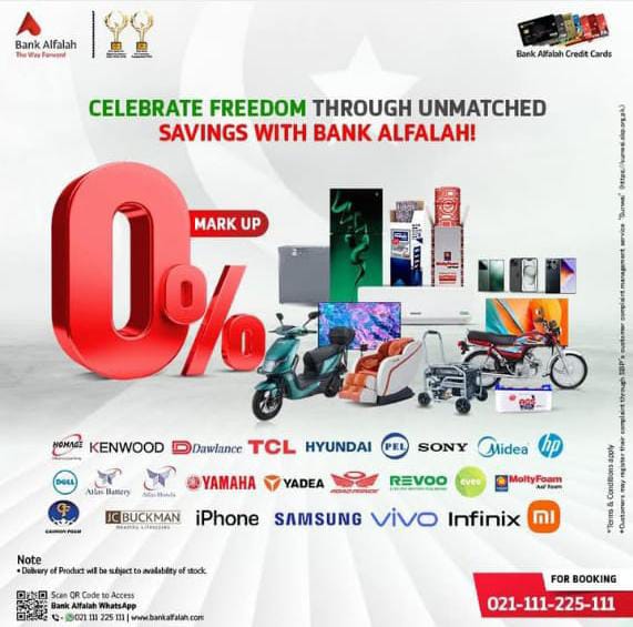 Islamabad, Aug 9, 2025: In celebration of Pakistan’s Independence Day, Bank Alfalah is bringing an unbeatable shopping opportunity for its customers — 0% markup on a wide range of top brands.