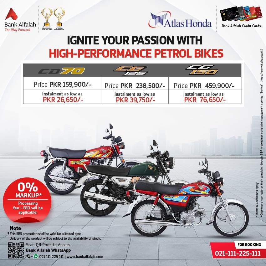 Fuel your passion for two-wheel adventures with the Bank Alfalah Atlas Honda installment plan. Now you can own your dream high-performance bike without financial stress. With flexible monthly payments and 0% markup, Bank Alfalah makes bike ownership more affordable and convenient than ever.