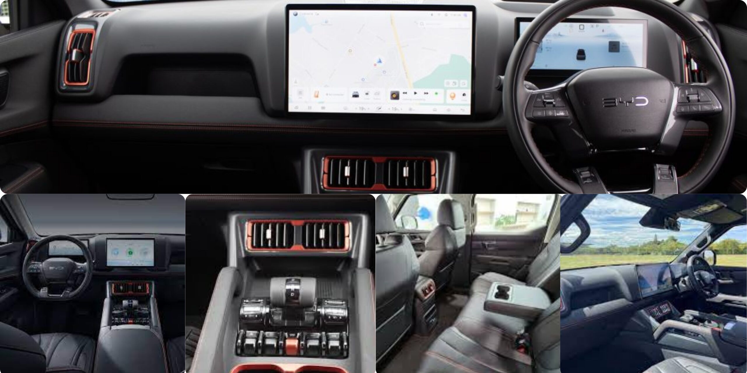 Step inside the BYD Shark 6, and you’ll be greeted by a high-tech, driver-focused plush cabin accessorized with fluorescent orange and black interior. Featuring a large digital dashboard and a rotational touchscreen infotainment system that puts everything you need right at your fingertips.