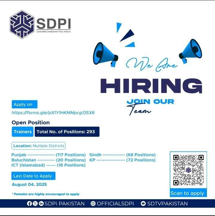 Islamabad, July 26, 2025: The Sustainable Development Policy Institute (SDPI) has brought new career opportunity, announcing multiple job openings for trainers across the country.