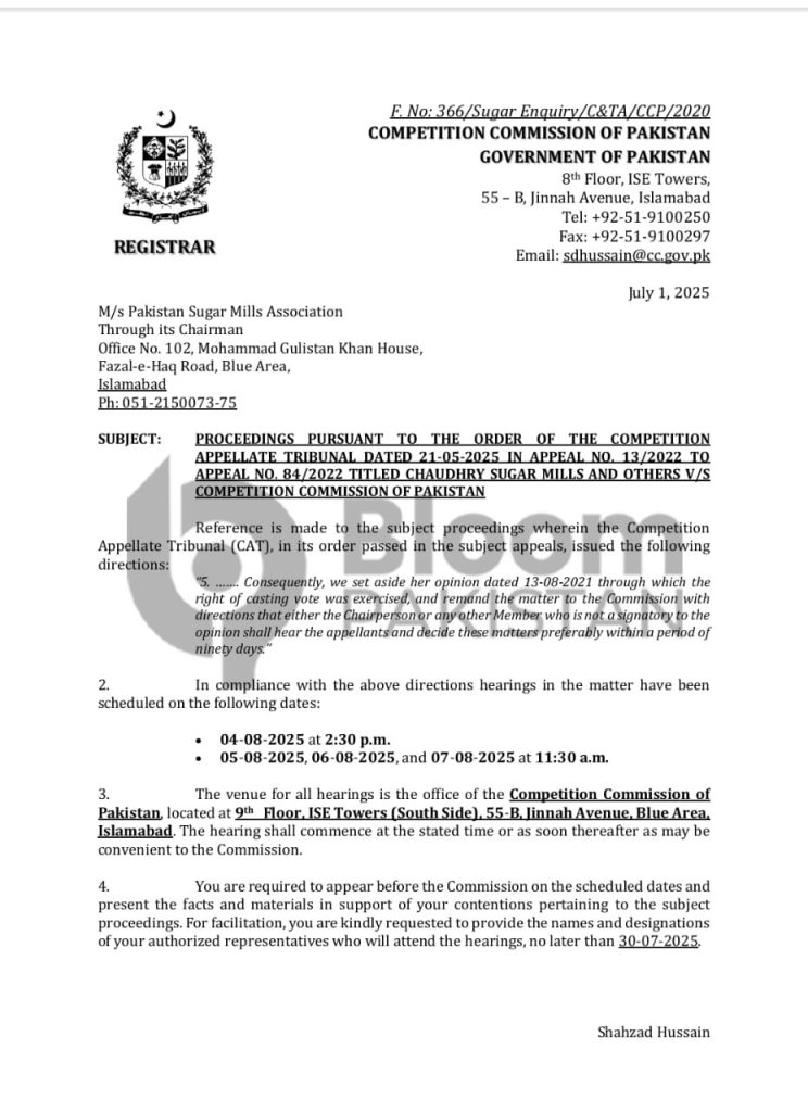 ISLAMABAD, July 9: The Competition Commission of Pakistan (CCP) has issued notices to the Pakistan Sugar Mills Association (PSMA) and its member sugar mills to appear for a hearing in the matter of show cause notices issued to PSMA and member mills in November 2020 for alleged cartelization and anti-competitive conduct. The proceedings are scheduled for August 4th, 5th, 6th and 7th, 2025.