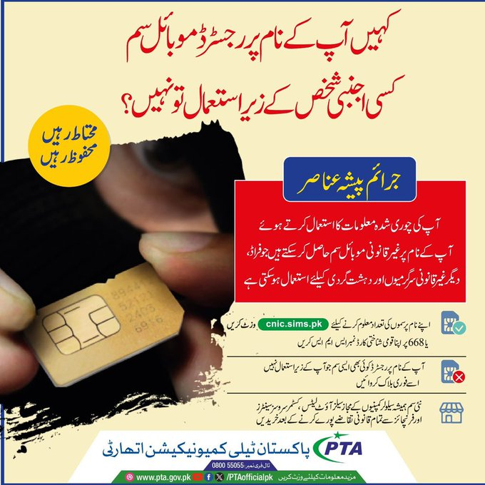 Islamabad, Aug 16, 2025: Criminals can misuse SIMs registered in your name by obtaining them illegally through stolen identity information. Such SIMs may later be used for fraud, scams or even terrorism-related activities.