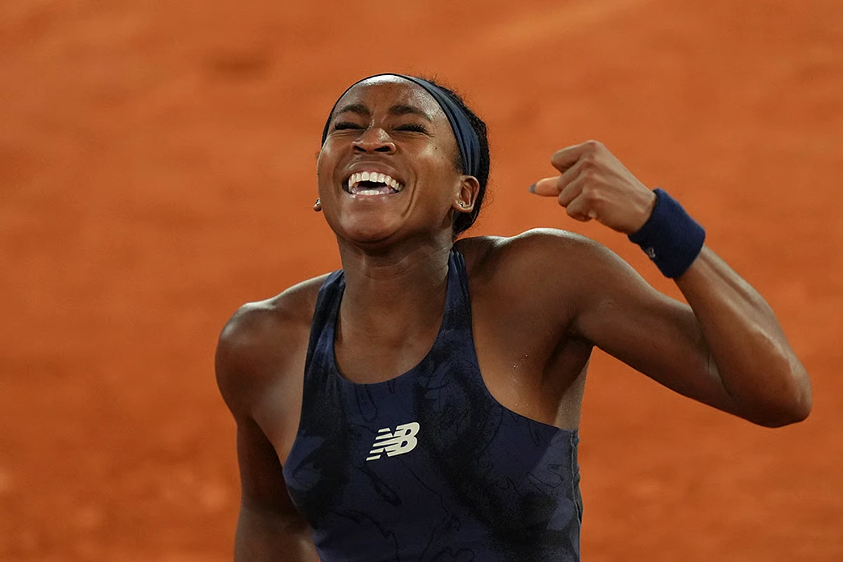 Islamabad, June 6, 2025: Coco Gauff of the United States celebrated her victory after winning the semifinal match against the France’s Lois Boisson at Roland-Garros in Paris.