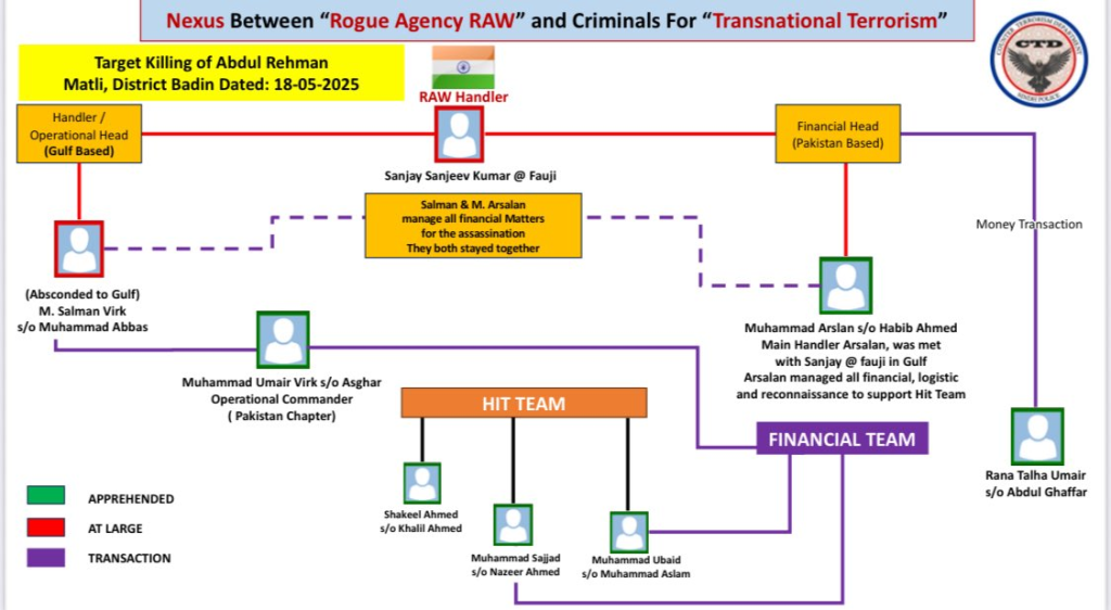 According to Additional Inspector General of CTD Sindh, Azad Khan, the network received financial and logistical support from RAW. Senior officials further revealed that the network was behind the targeted killing of a citizen in Matli, Badin, on May 18, 2025.