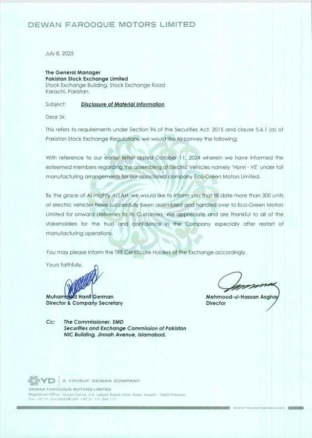 This marks a major milestone in Dewan Farooque Motors’ comeback, as confirmed in its latest filing to the Pakistan Stock Exchange (PSX). The update follows the October 2024 agreement between DFML and Eco-Green Motors under a toll manufacturing partnership.