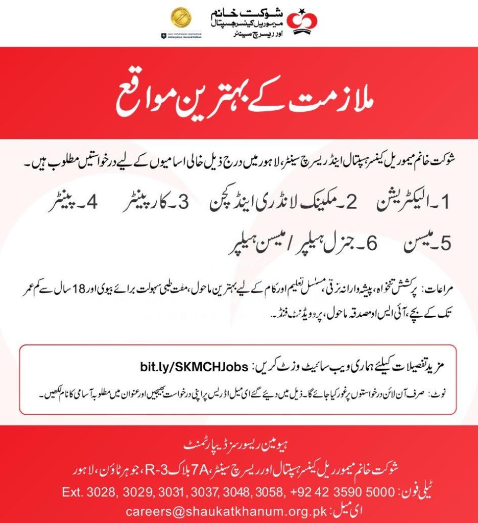 LAHORE, June 1, 2025: Applications have been invited for vacant positions at Shaukat Khanum Memorial Cancer Hospital and Research Center (SKMCH) in the provincial capital Lahore.
