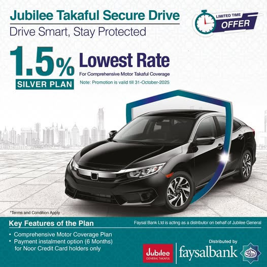 Islamabad, July 24, 2025: Unlock peace of mind every time you hit the road with Jubilee Takaful Secure Drive, now brought to you through Faysal Bank under an exclusive partnership with Jubilee General – WTO. With a limited-time offer of just 1.5% – the lowest rate ever under the Silver Plan, this is your chance to enjoy full motor takaful coverage with easy 6-month installments that fit your budget perfectly.