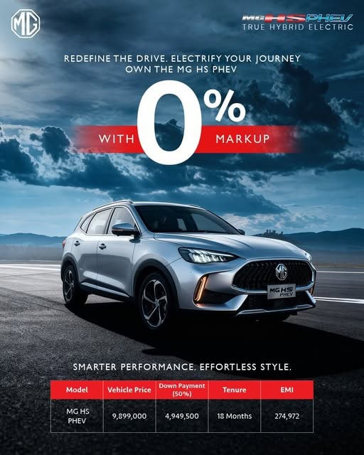 Under this offer, customers can purchase the MG HS PHEV at a vehicle price of Rs. 9,899,000 with a 50% down payment and an 18-month tenure. The monthly installment (EMI) stands at Rs. 274,972, making it an attractive option for buyers interested in hybrid technology without financial strain.