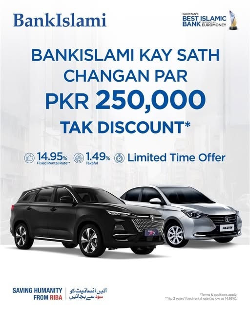 BankIslami has introduced a new Changan car financing offer, giving customers a chance to save up to Rs. 250,000 on popular models like the Alsvin and Oshan X7.