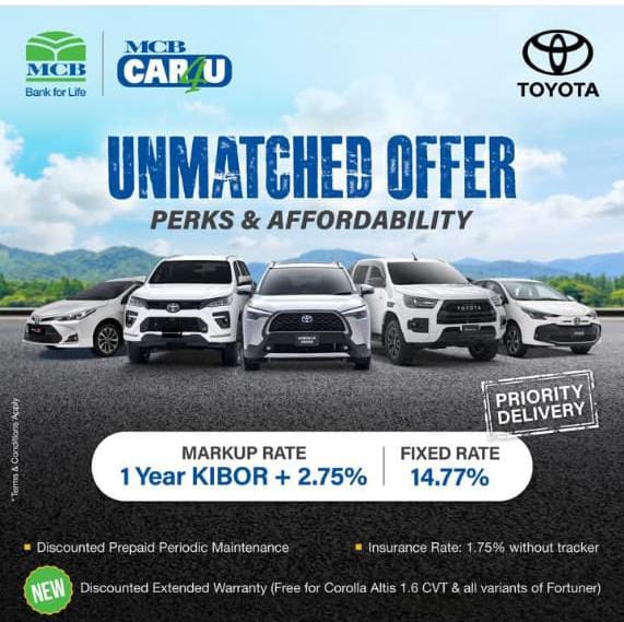 Looking for a reliable Toyota installment plan that combines affordability, flexibility, and exclusive benefits? MCB Bank brings you an unmatched financing opportunity where you can enjoy budget-friendly monthly payments, attractive markup rates, and added perks such as discounted maintenance and extended warranties. Take the wheel of your favorite Toyota today with complete peace of mind.
