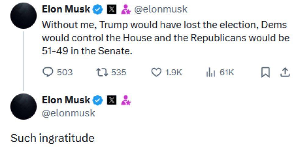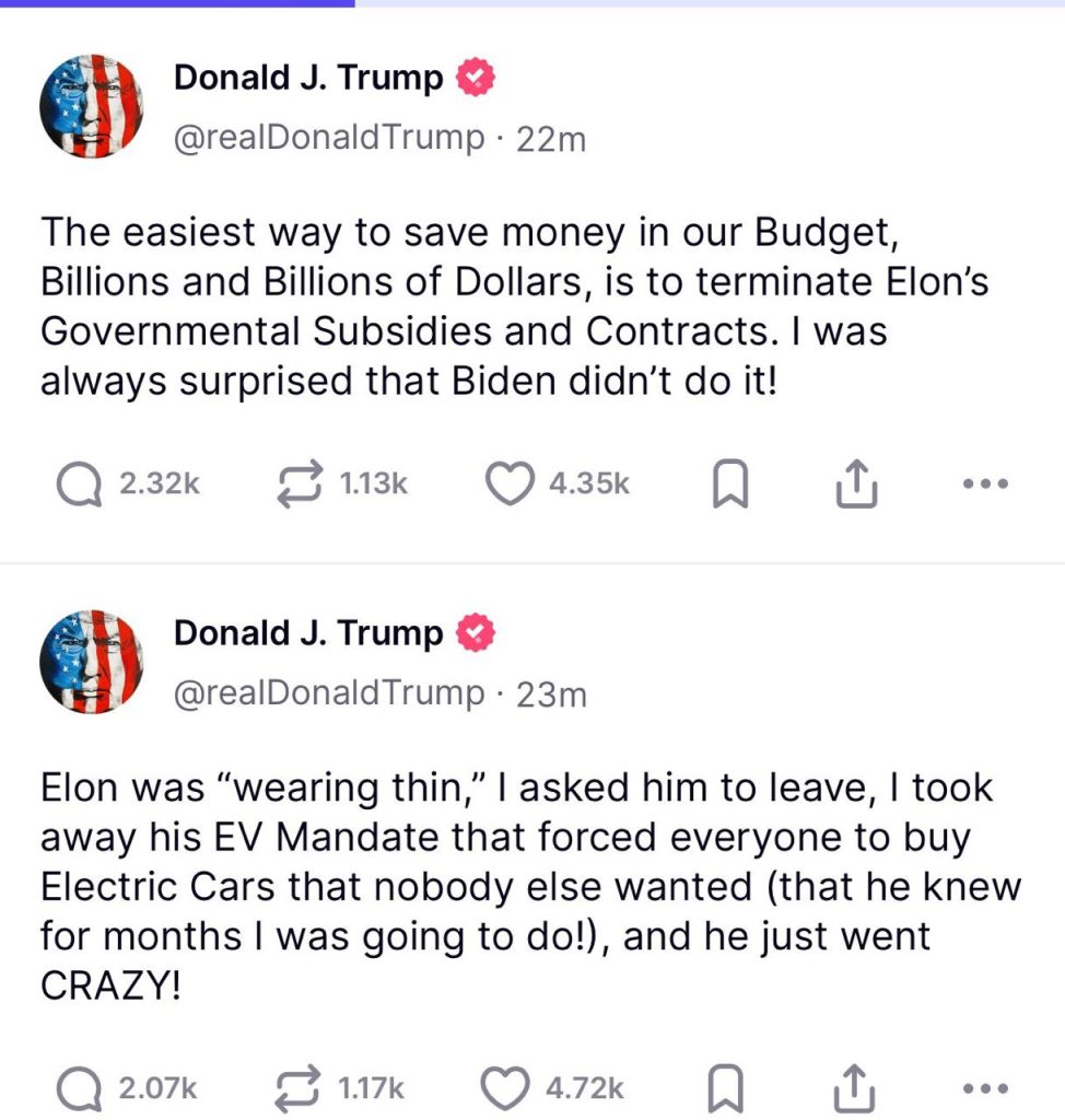“The easiest way to save money in our Budget, Billions and Billions of Dollars, is to terminate Elon’s Governmental Subsidies and Contracts. I was always surprised that Biden didn’t do it!”