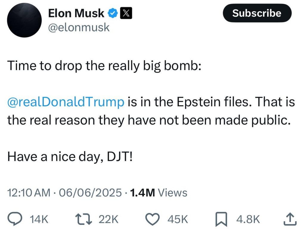 Musk escalated the feud dramatically by hinting at a dark secret. In a bombshell post on June 6, 2025, Musk tweeted: