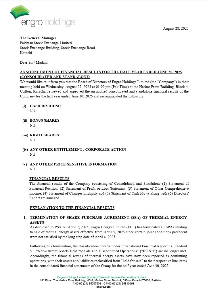 Engro Holdings Limited, formerly known as Dawood Hercules Corporation, reported a consolidated profit of Rs. 73.3 billion for the half year ended June 30, 2025, significantly higher than Rs. 13.8 billion in the same period last year. This sharp increase was mainly due to a one-time accounting gain from the reversal of previously recorded losses on its thermal energy assets, which were earlier marked for sale but are now being retained. Without this one-off adjustment, the underlying profit for the period stood at Rs. 19.6 billion, with Rs. 9 billion attributable to shareholders.