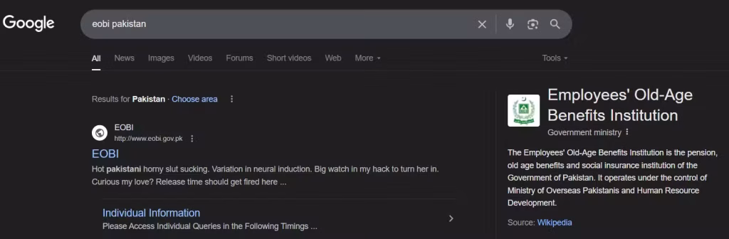 Pakistanis were left shocked when explicit search terms appeared under the official website of the Employees’ Old-Age Benefits Institution (EOBI) following what seemed to be a hacking attempt or unauthorized backend changes.