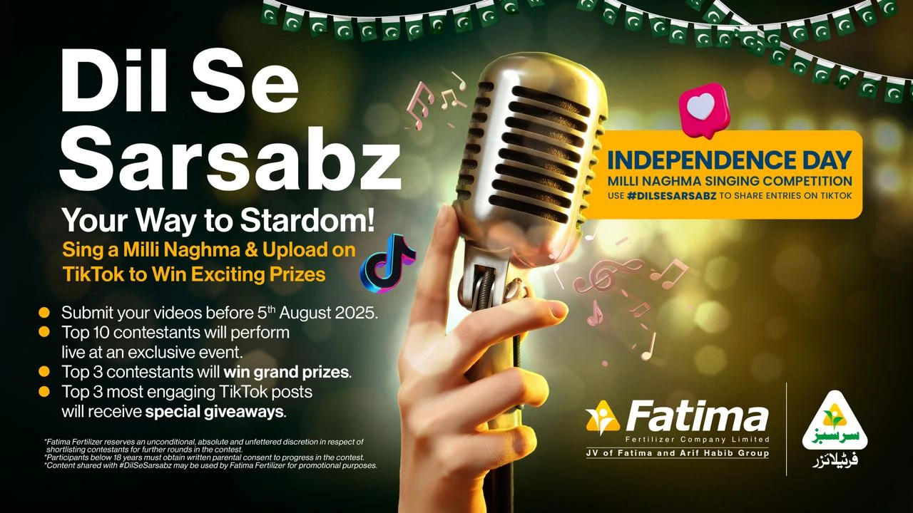Islamabad, July 31, 2025: Giving a new spirit to the Independence Day celebrations, Fatima Fertilizer has, for the first time, taken a unique approach by engaging the youth through its ‘Dil Se Sarsabz’ Milli Naghma singing competition. This nationwide contest aims to revive the patriotic spirit and empower young Pakistanis through music and digital creativity, making Independence Day celebrations more vibrant and inclusive than ever before.