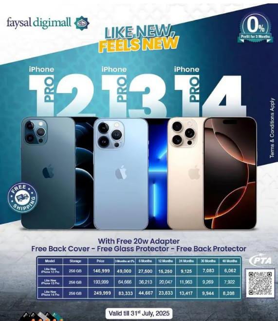 Islamabad, July 16, 2025: Faysal Bank is now offering a golden opportunity for Apple lovers! Through Faysal Digimall, customers can now own PTA approved iPhone 12 Pro, 13 Pro, and 14 Pro (256GB) models at unbelievably affordable monthly installments, starting from just Rs.6,062 with 0% profit for 3 months.