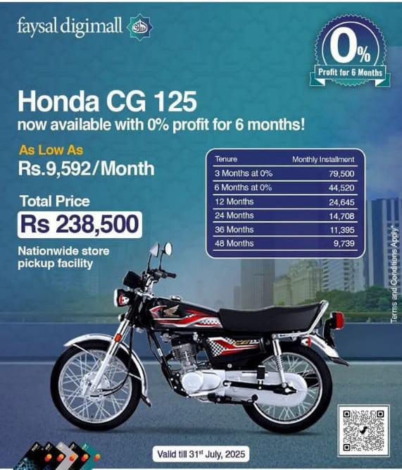 Islamabad, July 27, 2025: Good news for bike enthusiasts in Pakistan! Faysal Digimall has rolled out an exciting offer on the Honda CG 125, giving you the freedom to ride with ease and affordability. With 0% profit for the first 6 months, this deal is a perfect opportunity to grab your dream bike without any financial strain.
