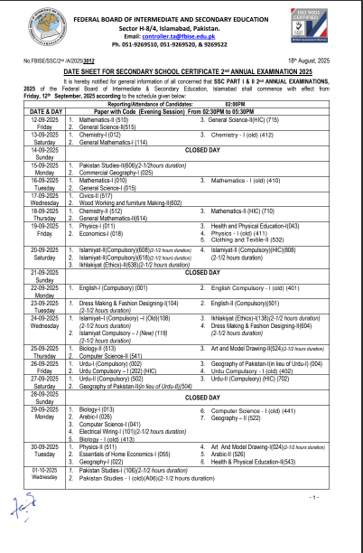 The FBISE Matric 2nd Annual Exams 2025 date sheet has been officially announced for Class 9 and 10 students. According to the schedule, the Secondary School Certificate (SSC) Part I and II exams will begin in September 2025.