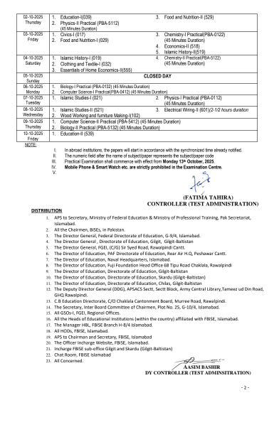 Practical exams for both classes will start from Monday, 13 October 2025. Students are advised to check the full date sheet on the official FBISE website and prepare accordingly.