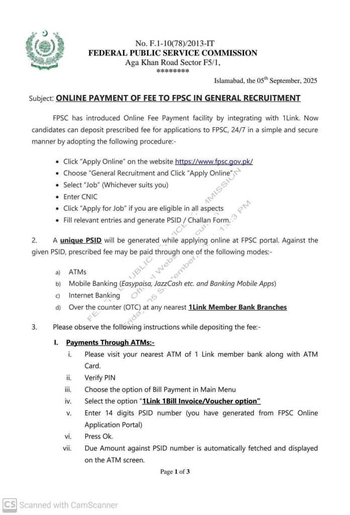 The Federal Public Service Commission (FPSC) has officially introduced an online fee payment system for all tests through JazzCash, EasyPaisa, mobile banking apps, ATMs, and over-the-counter (OTC) banking channels. This step aims to make the fee submission process simpler, faster, and available 24/7 for candidates across Pakistan.