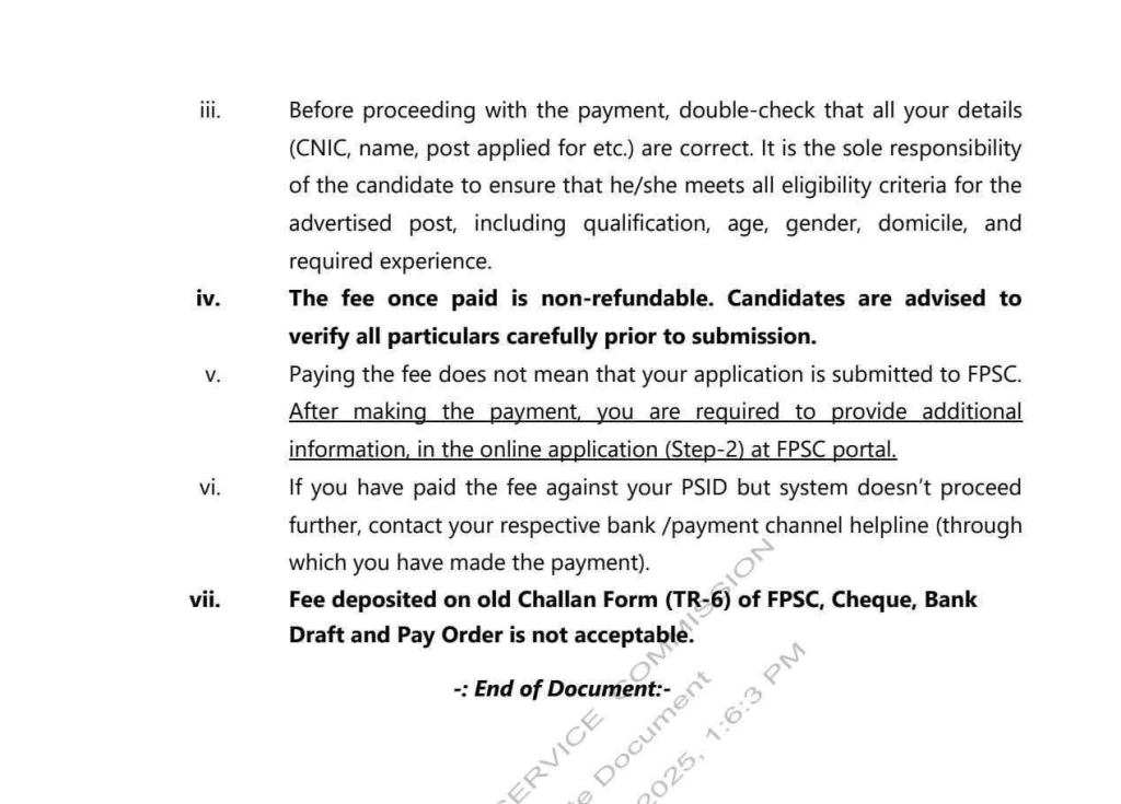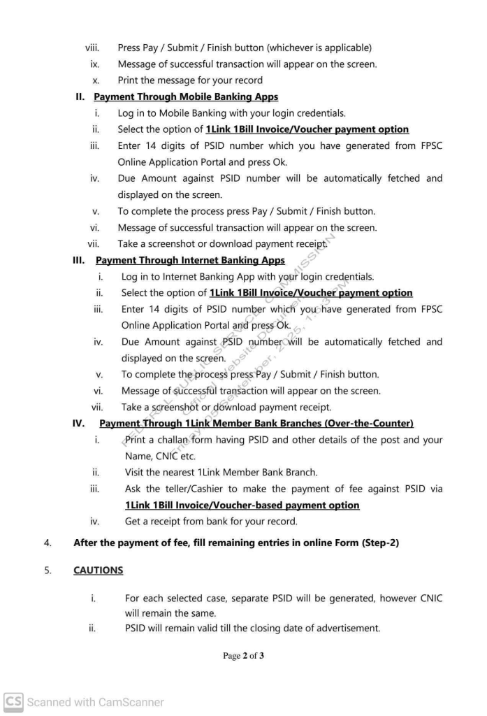 According to FPSC’s notification, the new facility has been integrated with 1-Link to ensure secure and real-time payment processing. Candidates applying for FPSC General Recruitment can now generate a PSID (Payment Slip ID) during the online application process, against which the prescribed fee can be paid through the following methods: