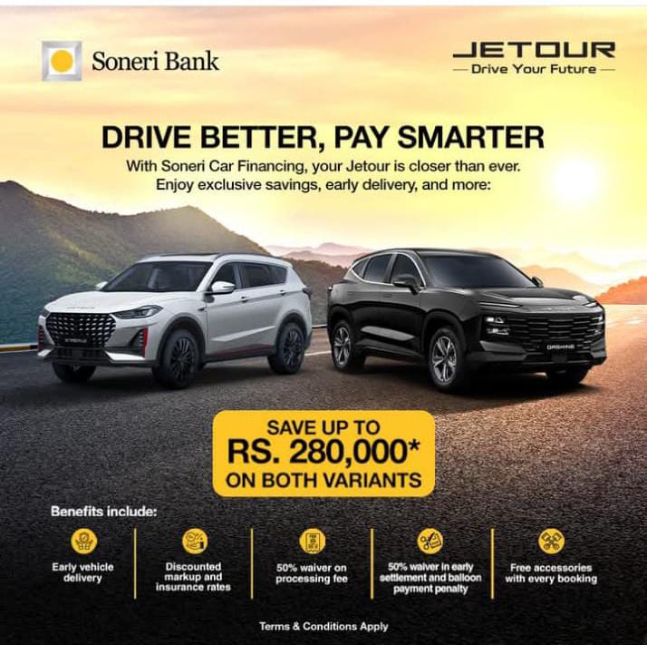 Your Jetour is now more affordable with Soneri Bank’s exclusive car financing! Get up to Rs. 280,000 in savings, enjoy faster delivery, special insurance discounts, and more. Drive smarter and pay easier with Soneri Car Finance.