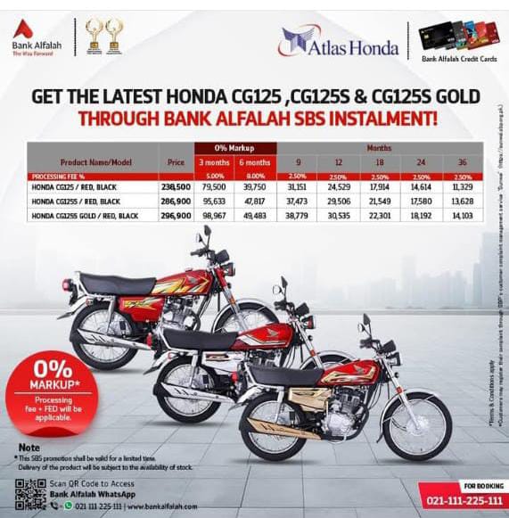 Atlas Honda, in collaboration with Bank Alfalah, is offering motorcycle enthusiasts an exciting chance to own their favorite Honda CG125, CG125S, and CG125S Gold on easy instalments. This limited-time offer makes it easier than ever to ride Pakistan’s most loved bikes without financial stress.