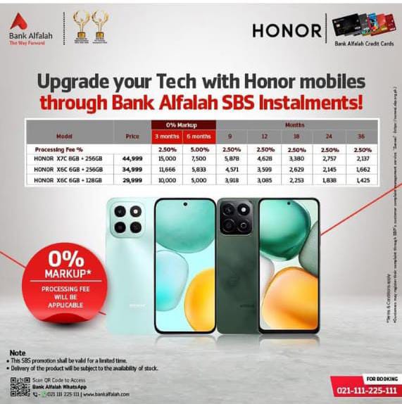 Apply online at Bank Alfalah – HONOR Deals or call 021-111-225-111 for more information.