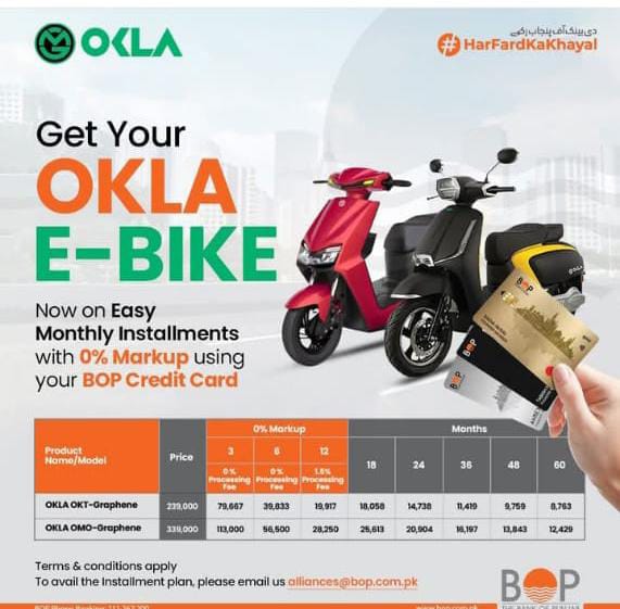 Ride into the future with OKLA E-Bikes now available on easy monthly installments with 0% markup using your Bank of Punjab (BOP) Credit Card. Designed for comfort, style, and eco-friendly travel, OKLA E-Bikes are the perfect choice for modern riders.