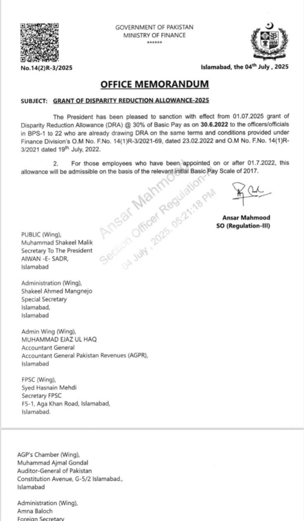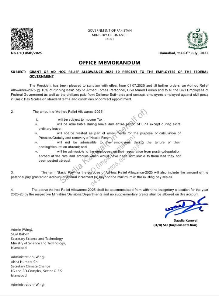Islamabad, July 5, 2025: The finance government on Friday issued regarding a notification for a 10 per cent rise in the salaries of federal government workers, alongside the approval of a Disparity Reduction Allowance (DRA) equivalent to 30 per cent of basic salary.
