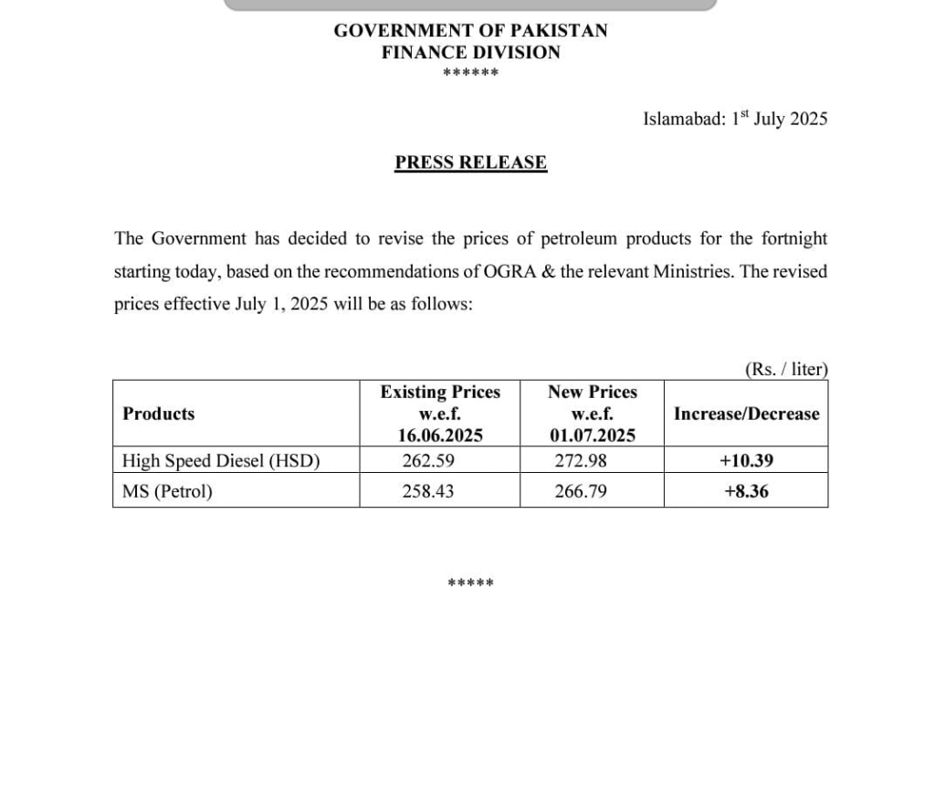 Islamabad, July 1, 2025: The government has announced yet another huge increase in petroleum products rates. As per a notification from the Finance Division, the petrol price has been raised by Rs. 8.36 per liter, bringing the new price to Rs. 266.79, while the rate of high-speed diesel has gone up by Rs. 10.39 to reach Rs. 272.98 per liter.