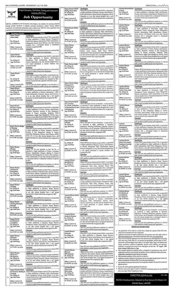 PECTA is looking to hire Deputy Directors (BPS-18) and Assistant Directors (BPS-17) in the following areas: