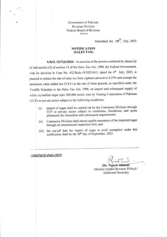 Islamabad, July 10, 2025: The federal authorities have reduced sales and withholding tax on sugar import to help curb inflation and maintain local availability ahead of the high-demand season.