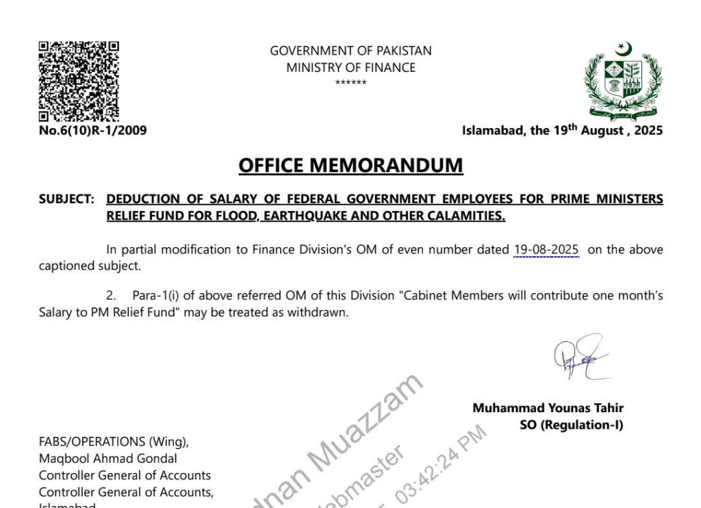 According to an official memorandum issued by the Ministry of Finance on 19th August 2025, the earlier directive stating, “Cabinet Members will contribute one month’s Salary to PM Relief Fund,” has been officially withdrawn.