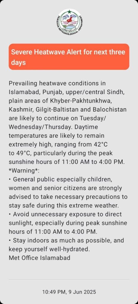 According to the Met Office, a severe heatwave is expected to persist across the country until Thursday. From today until June 12, daytime temperatures in upper regions — including Central/Upper Punjab, Islamabad, Khyber Pakhtunkhwa, Kashmir, and Gilgit-Baltistan — are likely to remain 5°C to 7°C above normal. In southern regions — including Upper/Central Sindh, Southern Punjab, and Balochistan — temperatures are expected to stay 4°C to 6°C higher than usual.