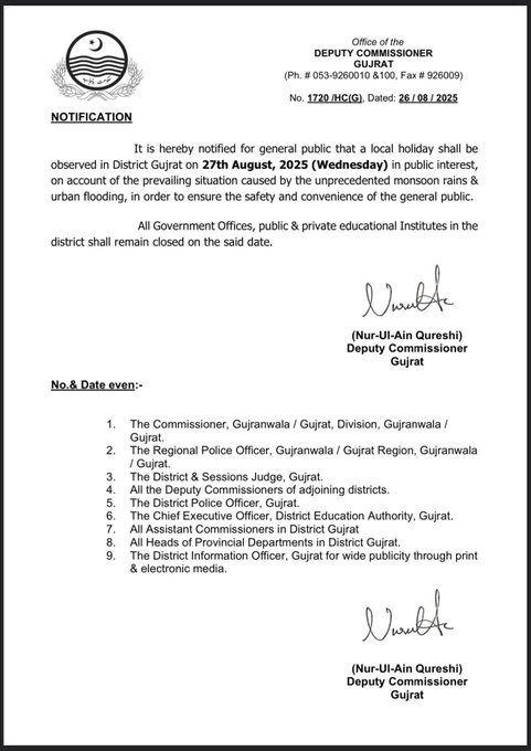 A public holiday has been officially declared in Gujrat District for Wednesday, 27th August 2025, due to severe monsoon rains and rising concerns over urban flooding.