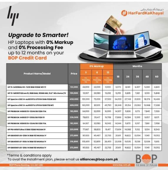 Whether you’re a student, professional, or gamer, Bank of Punjab brings you the chance to upgrade to smarter HP laptops without worrying about high upfront costs. Choose from top models like HP Spectre, HP ProBook, and HP 15 Series—all available at affordable monthly installments.