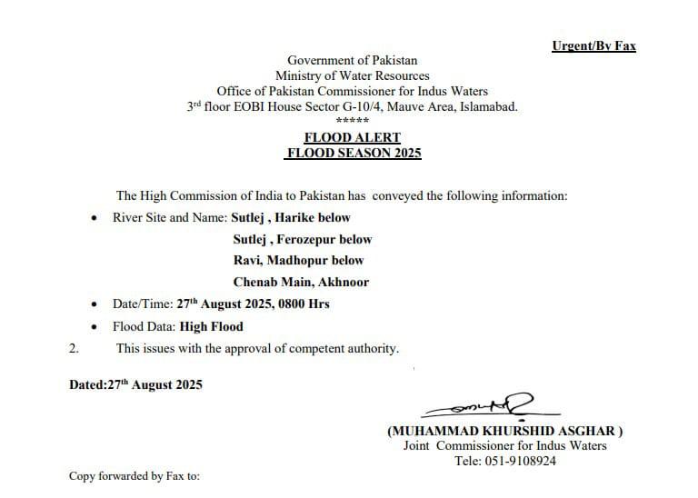 The Indian High Commission has formally notified Pakistan about the release of water into major rivers, including the Ravi, Chenab, and Sutlej. According to the official communication, large flood waves are expected to pass through these rivers today, August 27, 2025.