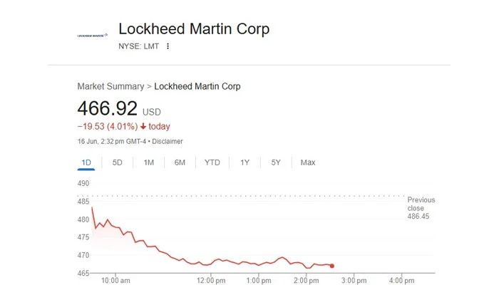 Following Iran’s bold announcement, the financial markets reacted swiftly — Lockheed Martin’s shares on the NYSE (Ticker: LMT) saw a sharp drop of 4.01%, closing at $466.92 during midday trading on June 16.