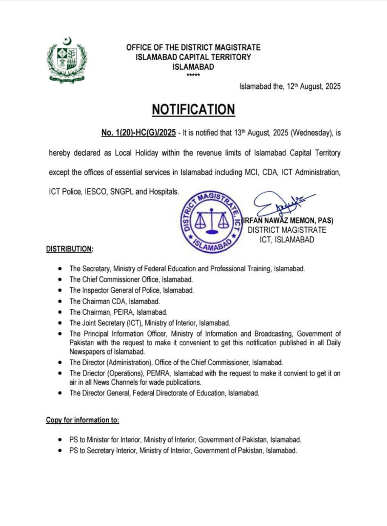 Islamabad, Aug 12, 2025: The Islamabad Capital Territory (ICT) administration has announced that Wednesday, August 13, 2025, will be a local holiday across the federal capital’s revenue limits.