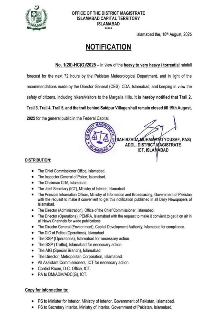 Islamabad, 16th August 2025: The District Magistrate of Islamabad has issued a notification warning the public about heavy to very heavy rainfall forecasted over the next 72 hours by the Pakistan Meteorological Department. To ensure the safety of citizens, particularly hikers and visitors to the Margalla Hills, several popular trails will remain closed until 19th August 2025.
