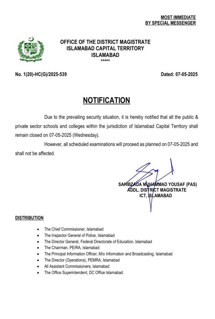 It is pertinent to mention here the decision applies to both public and private schools, colleges, and universities in the federal capital.