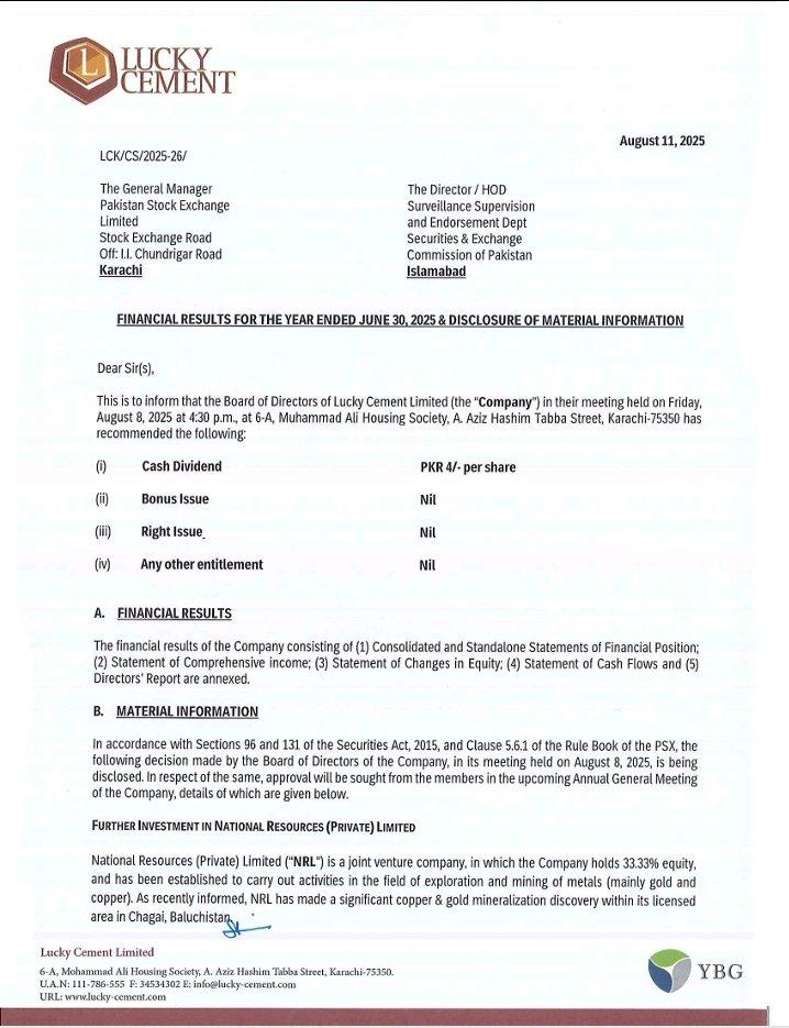 Islamabad, Aug 11, 2025: Lucky Cement Limited has announced a major investment of up to Rs1.2 billion in National Resources (Pvt) Ltd to advance pre-feasibility studies following a significant copper and gold discovery in Chagai, Balochistan. This strategic move highlights Lucky Cement’s growing diversification beyond cement into the lucrative mining sector.