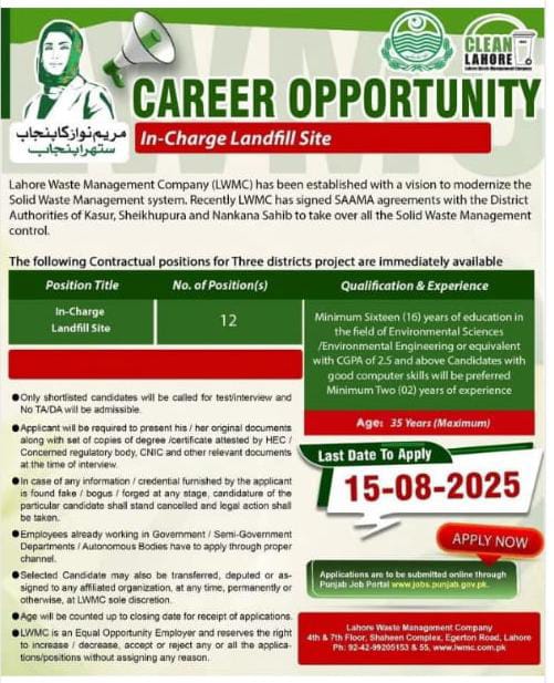 Islamabad, Aug 3, 2025: Lahore Waste Management Company (LWMC), committed to modernizing Punjab’s solid waste management system, has announced 12 contractual job openings for the position of In-Charge Landfill Site. These opportunities span across three major districts: Kasur, Sheikhupura, and Nankana Sahib, under newly signed SAAMA agreements.