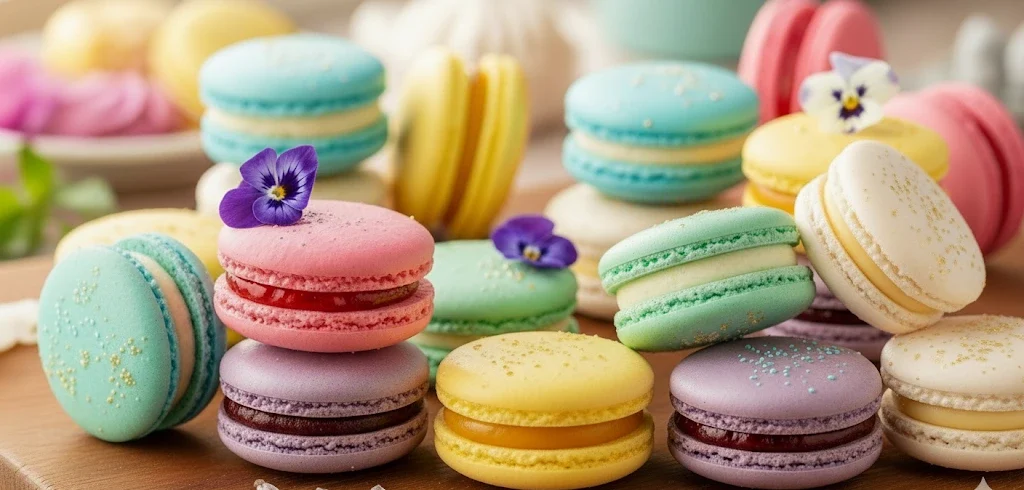 French meringue macaron, a colourful sweet with a crisp shell and creamy filling, loved worldwide for its charm and taste.