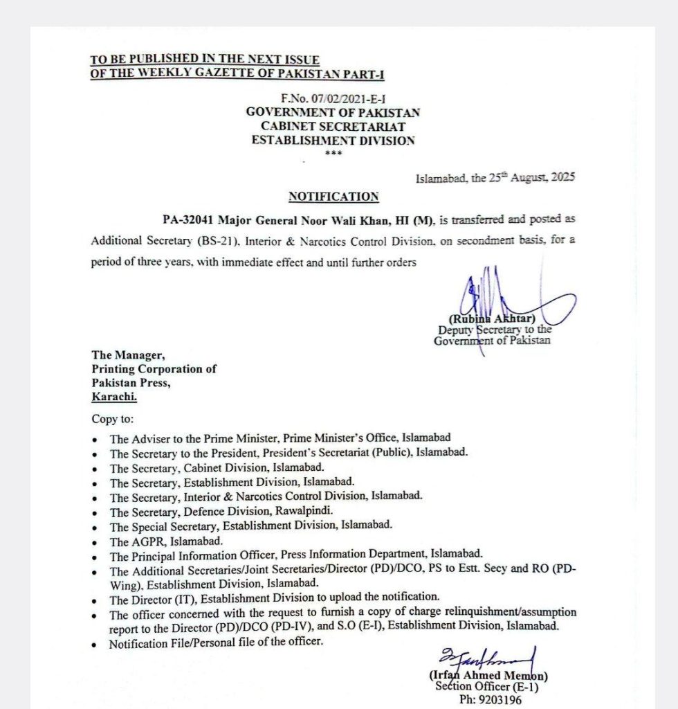 Islamabad, August 25, 2025 – The Government of Pakistan has announced the transfer and posting of Major General Noor Wali Khan, HI (M), as Additional Secretary (BS-21), Interior & Narcotics Control Division.
